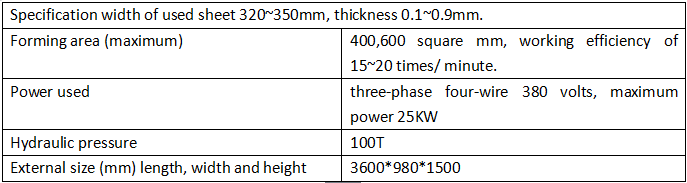 Parameter teknis Mesin Pembuat Pembibitan Baki Pembibitan Spesifikasi lebar lembaran bekas: 300~320mm, ketebalan: 0,8~2mm. Area pembentukan (maksimum): 400*600 mm, efisiensi kerja 15~20 kali/menit. Daya yang digunakan: tiga fasa empat kawat 380 volt, daya maksimum 25KW Tekanan hidrolik: 100T Ukuran eksternal (mm) panjang, lebar dan tinggi) 3600mm*980mm*1500mm