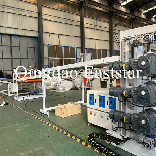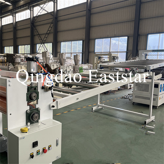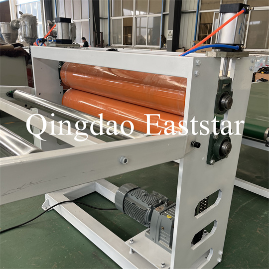 Peralatan ekstruder pelat anti-selip PVC lunak: Peralatan ini terutama terdiri dari ekstruder sekrup tunggal, kalender tiga rol, pendingin 6 meter