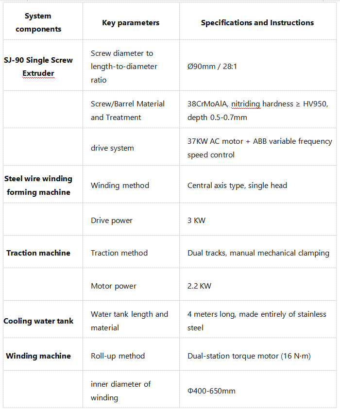 Integrasi Otomatis, Efisiensi Unggul: Dari penggulungan kawat baja, lapisan ekstrusi PVC, pendingin air, traksi hingga penggulungan otomatis dua stasiun, seluruh lini beroperasi secara otomatis, meningkatkan efisiensi produksi secara signifikan dan mengurangi biaya tenaga kerja.